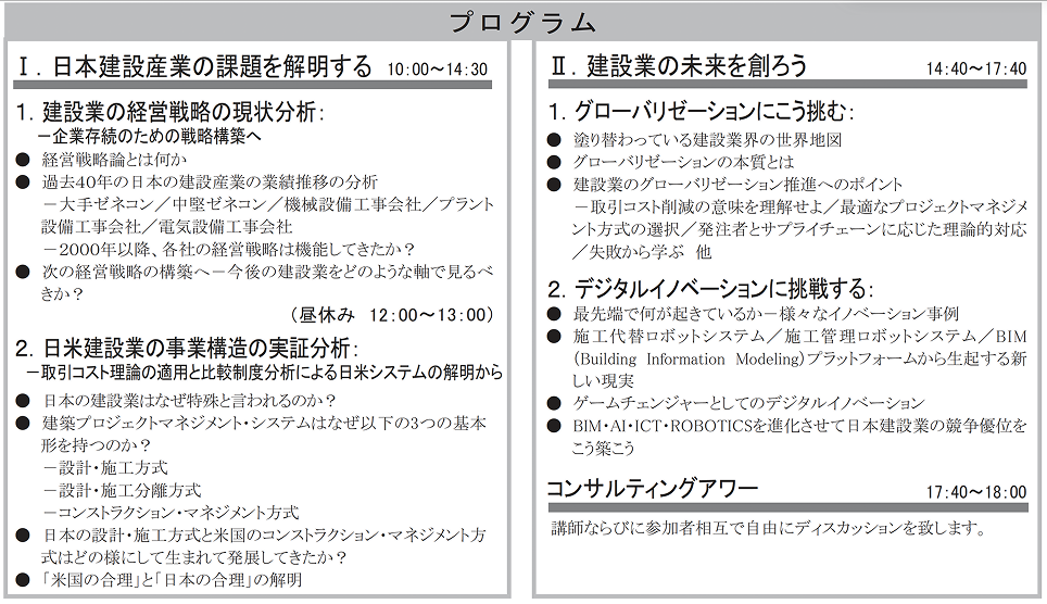当プログラムの後半は、建設業界におけるグローバリゼーションとデジタルイノメーションの問題に取組みます。そして日本の建設業の経営がイノベーションを起こすための条件を検討します。
