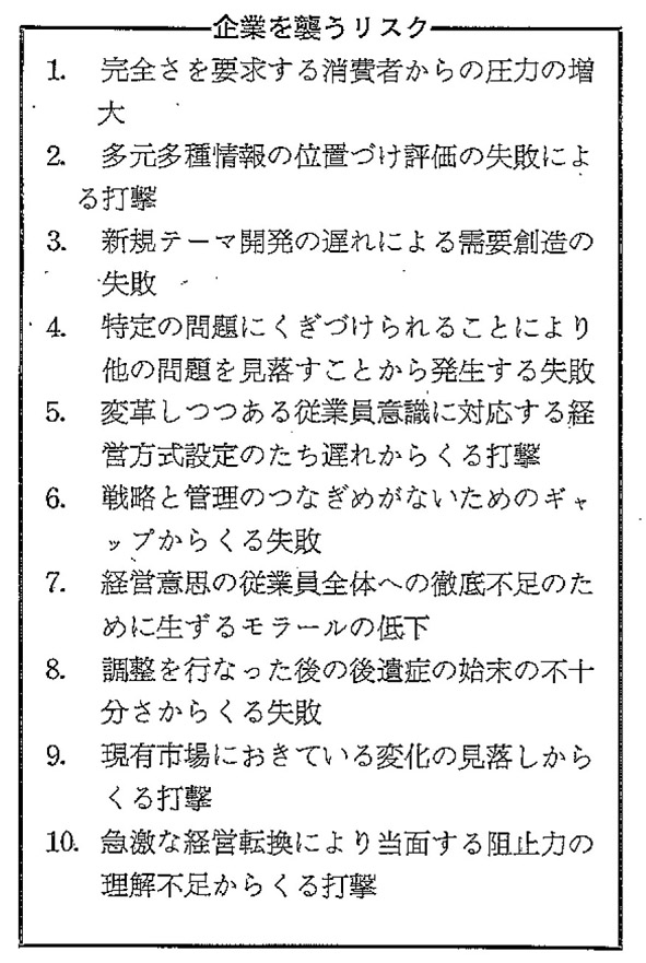 ただ、どのような予測が可能であるにしても、企業としてはたくさんの情報を選択し、その選択のもとで経営行動を設計しなければならない難しい立場におかれているのであります。本書をまとめました立場は、このような状況に立ち向かう第一の力は、主体的な構想の確立であるとする考え方であります。そして、そのような立場で、現代の諸変化と、将来の起こりうる事実を考えて見ますと、経営活動のいろいろな面で、従来通りのやり方では不整合な問題に突き当たり、動きがとれなくなるという事実であり、・・・。」
