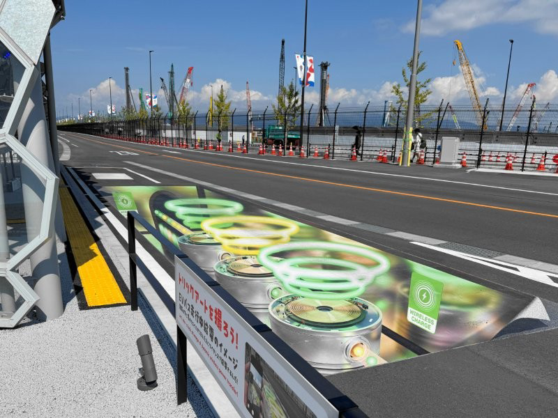 次いで大阪・関西万博の会期中、会場西側の外周路で走行中ワイヤレス給電設備を敷設しての実証実験が行われた。一般客を乗せて一定の距離を営業車で走行する実証実験は日本で初めての取り組みとなった。