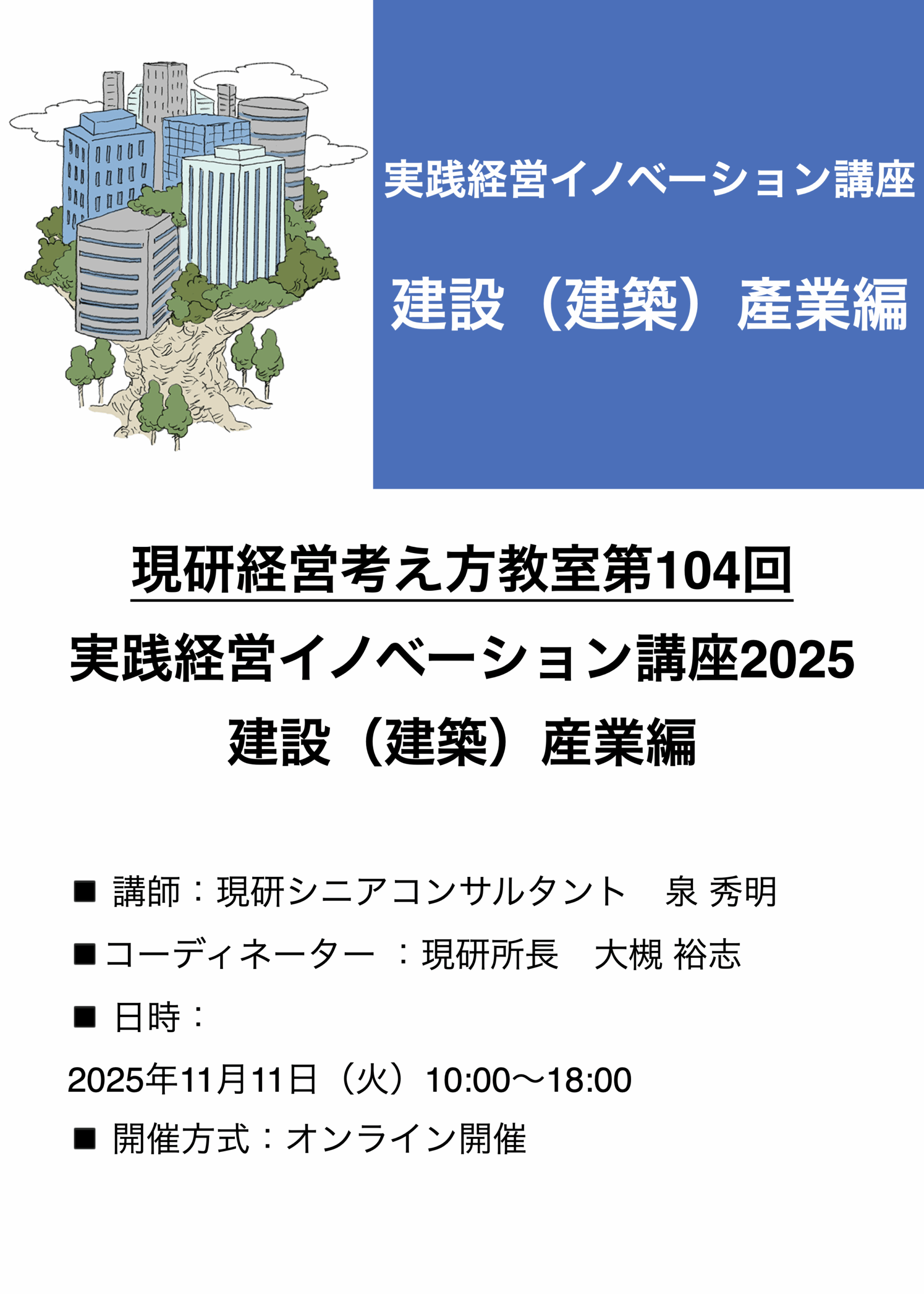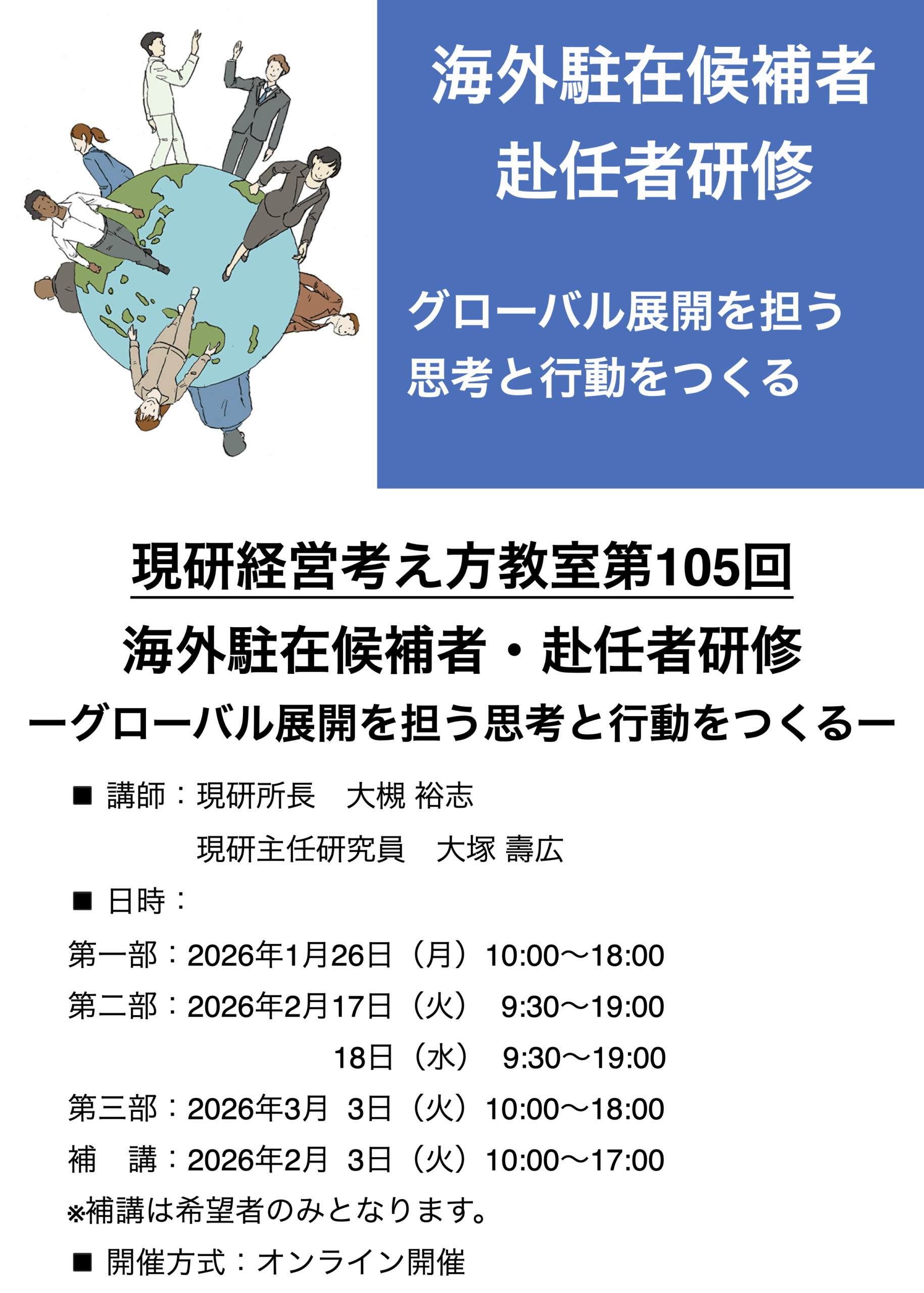 連続する競争環境の変動の中で、今後の企業の状況を予測すると、経営を主体的に考え、深い思考のもとに、現在・将来につながる実践的行動をとることができるリーダーの存在は不可欠です。そのようなリーダーを育成することを主旨として1995年に現研経営考え方教室がスタートし、ユニークな講座として高い支持を頂き、2025年に開講30周年を迎えました。